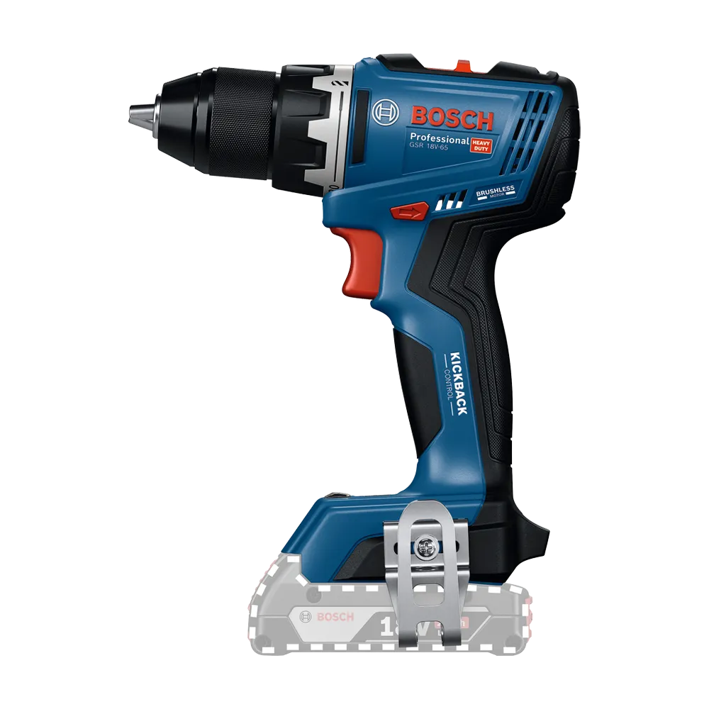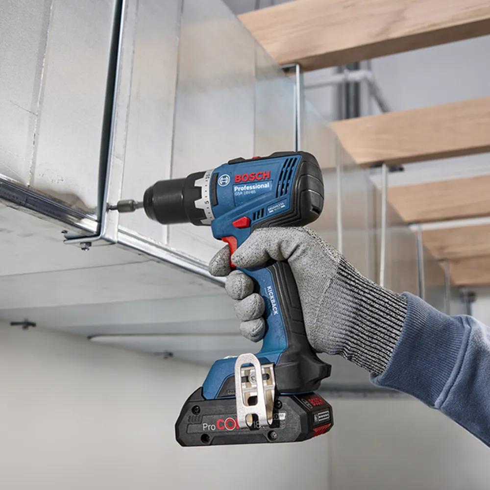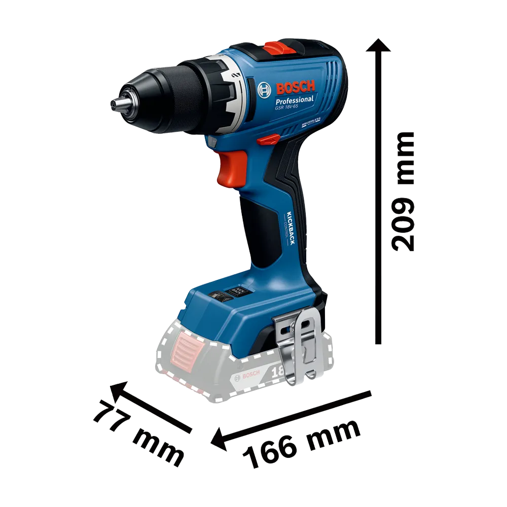 Njegov maksimalni obrtni moment od 63 Nm omogućava lako obavljanje teških zadataka, dok kompaktnu i praktičnu glavu duljine samo 166 mm posebno cijene majstori koji rade u skučenim prostorima. Bosch GSR 18V-65 Professional opremljen je naprednim sigurnosnim sistemom KickBack Control, koji se po potrebi može uključiti ili isključiti, a služi za sprečavanje povratnih udaraca u slučaju blokiranja svrdla. Dvostruko LED osvjetljenje poboljšava vidljivost radnog područja, što dodatno doprinosi preciznosti i sigurnosti rada.
