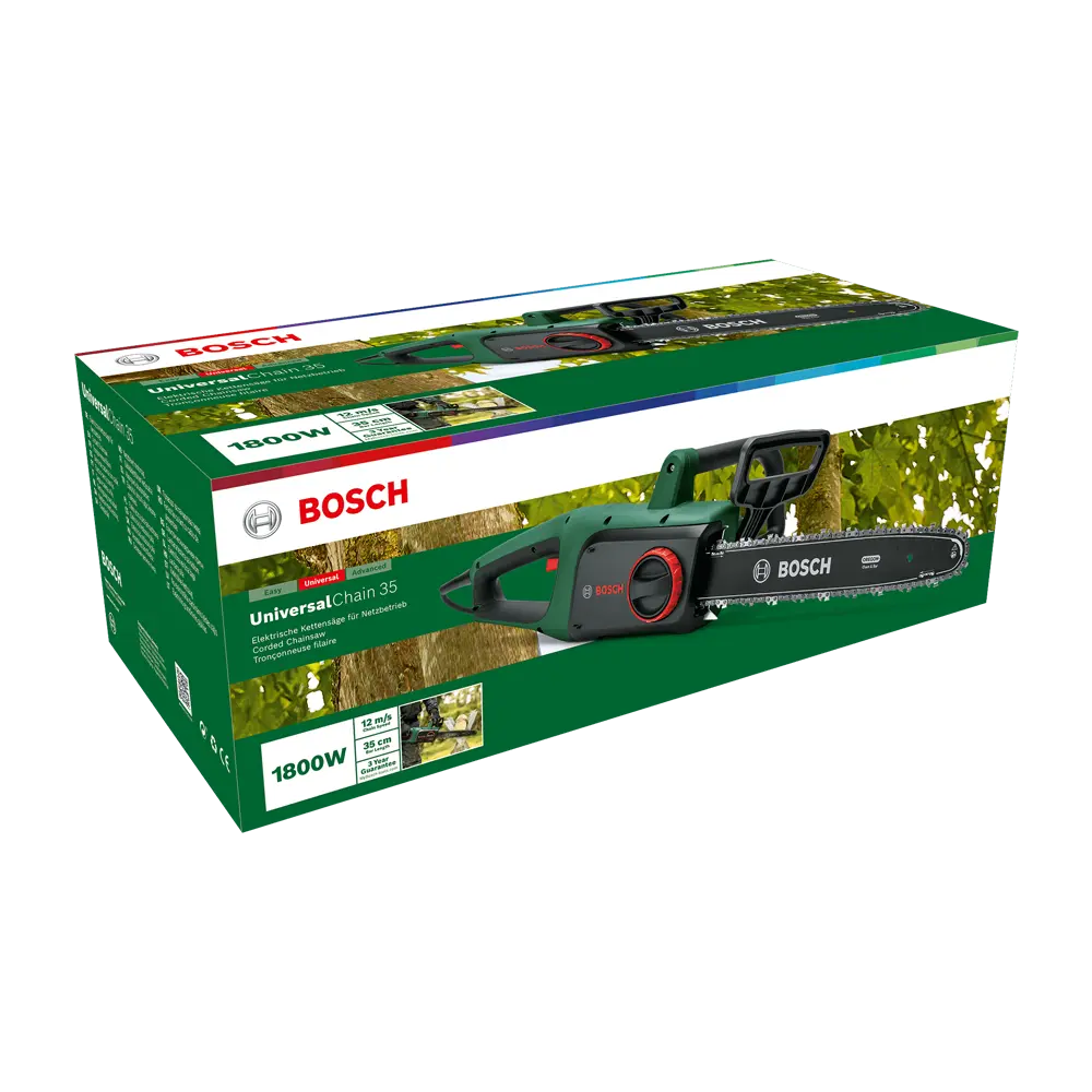 Bosch UniversalChain 35 je lagana i moćna električna lančana pila, dizajnirana za brzo i precizno rezanje drva, grana i trupaca uz minimalan napor. Snažan motor od 1.800 W i brzina lanca od 12 m/s omogućavaju visoke performanse, dok ergonomski dizajn i težina od samo 4.3 kg osiguravaju udobno rukovanje. Bosch SDS-sustav omogućava brzu izmjenu i zatezanje lanca bez upotrebe dodatnih alata, dok automatski sustav podmazivanja osigurava glatki rad bez zastoja. Kočnica sa zaštitom od povratnog udara jamči sigurnost korisnika, omogućavajući trenutačno zaustavljanje lanca u slučaju potrebe.