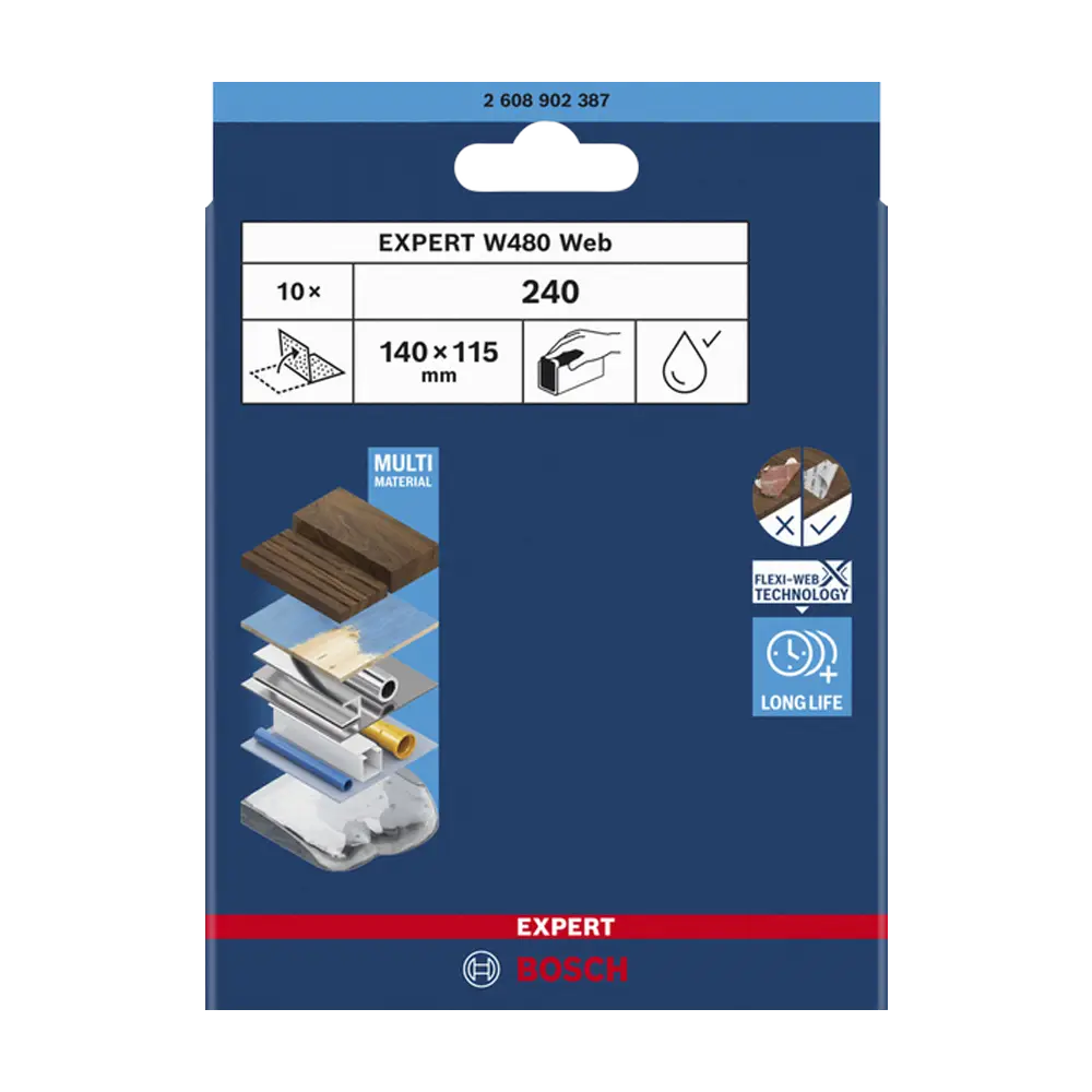 Bosch EXPERT W480 Web 1/4 je izdržljiv ručni brusni list dimenzija 115×140 mm, posebno dizajniran za precizno i učinkovito brušenje rubova, uglova i nepravilnih površina. Zahvaljujući vrhunskoj Bosch Flexi-Web tehnologiji, list se ne gužva niti trga, što omogućava dugotrajan rad bez prekida, čak i na zahtjevnim mjestima.