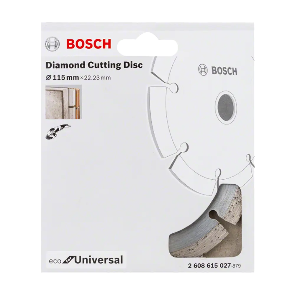 Bosch Eco univerzalna segmentirana dijamantska rezna ploča 115 mm je dijamantska rezna ploča namijenjena manjim kutnim brusilicama s maticom za zaključavanje. Idealna je za pouzdano rezanje u općim građevinskim materijalima kao što su beton, cigla, vapnenac i crijep. Sinterovani segmenti omogućavaju solidne performanse uz dugotrajan radni vijek, dok standardni provrt od 22.23 mm osigurava kompatibilnost s većinom kutnih brusilica.