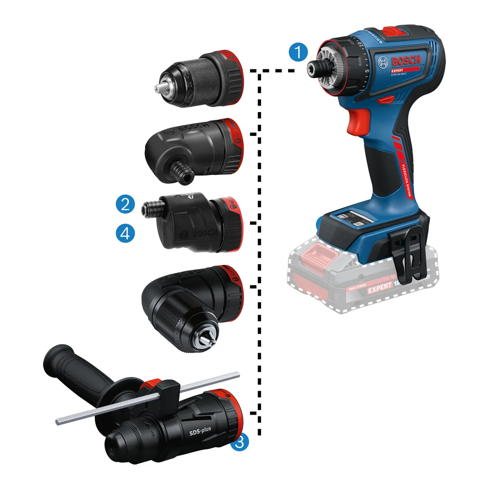 Bosch EXPERT EXSR18V-90FC je profesionalna akumulatorska bušilica-odvijač iz Bosch FlexiClick sistema koja donosi izuzetnu fleksibilnost 6-u-1 zahvaljujući brzo izmjenjivim nastavcima. Ovaj svestrani alat omogućava bušenje i zavrtanje u drvu, metalu, a uz dodatni nastavak GFA 18-H može se koristiti i za udarno bušenje u betonu, čime zamjenjuje više različitih alata na gradilištu.
