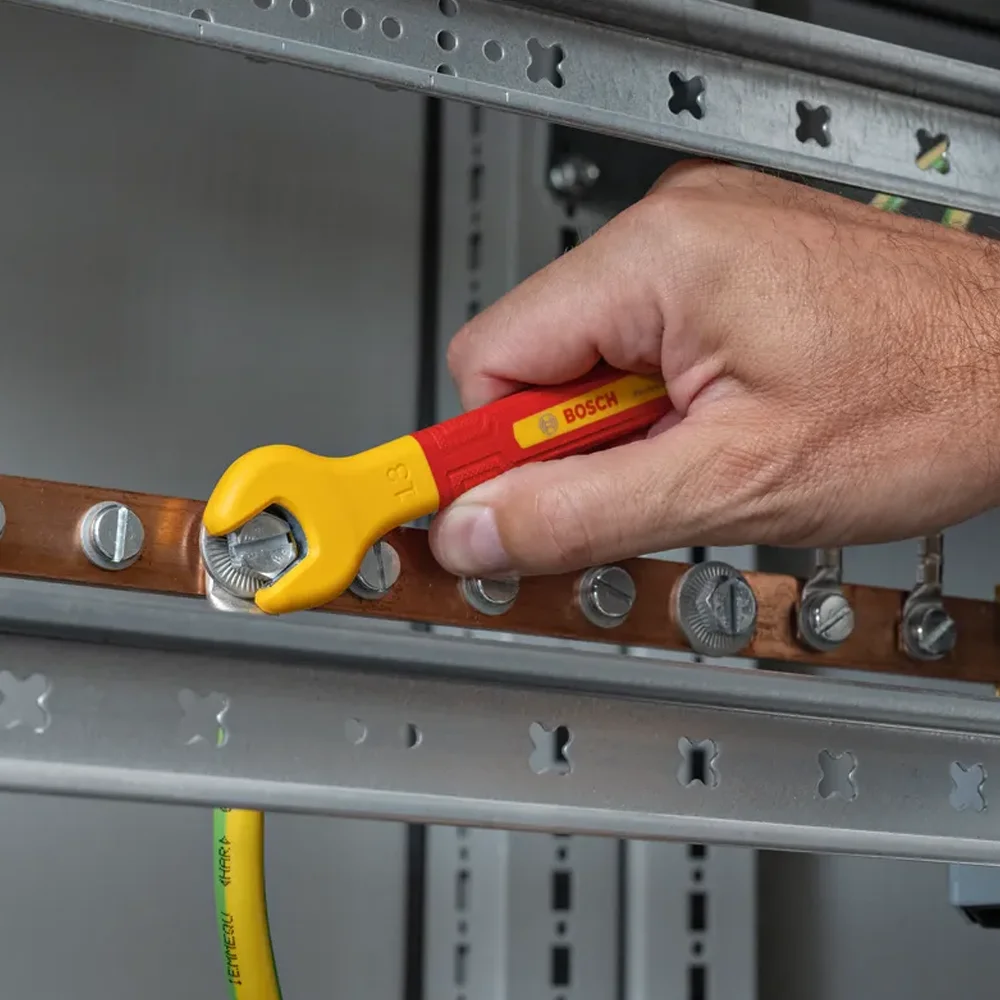 VDE viljuškasti ključevi – dimenzije 8 mm, 10 mm, 13 mm i 17 mm, s izoliranom ručkom i položajem čeljusti pod 15° za rad u skučenim prostorima.