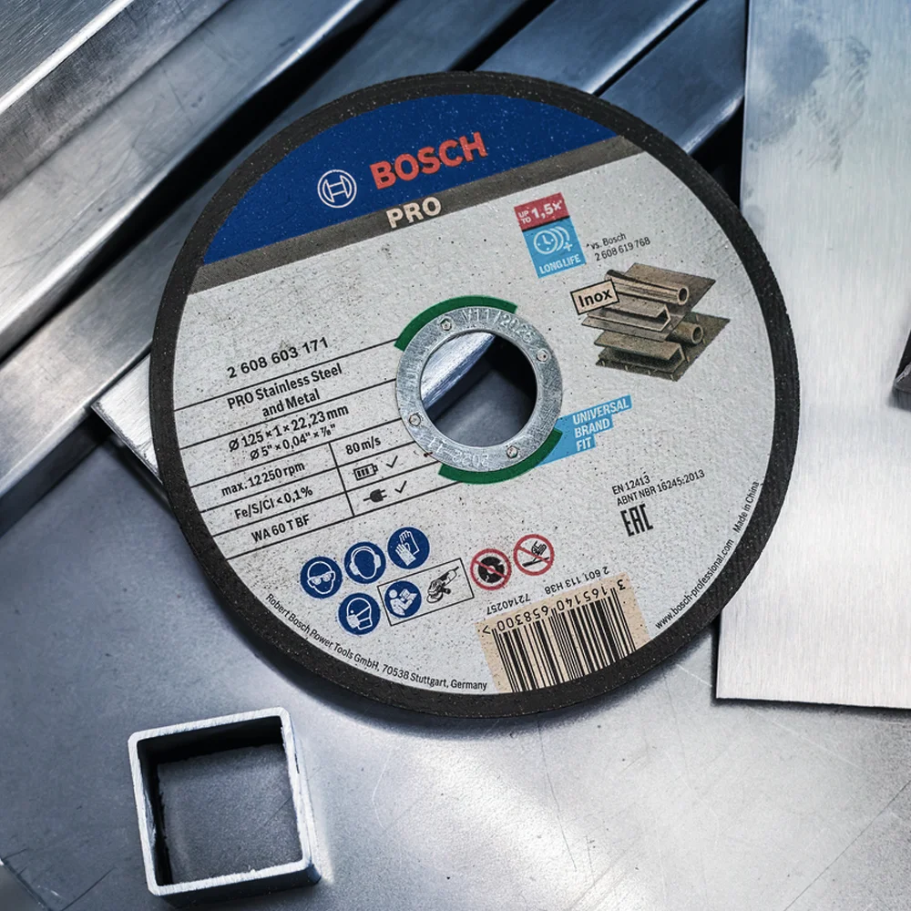 Rezna ploča PRO Stainless Steel and Metal idealna je za brzo i precizno rezanje nehrđajućeg čelika i metala, uz do 1.5 puta duži vijek trajanja u odnosu na standardne Bosch ploče. Zahvaljujući vrhunskim abrazivnim materijalima, pruža stabilan i siguran rad čak i pri zahtjevnim rezovima.