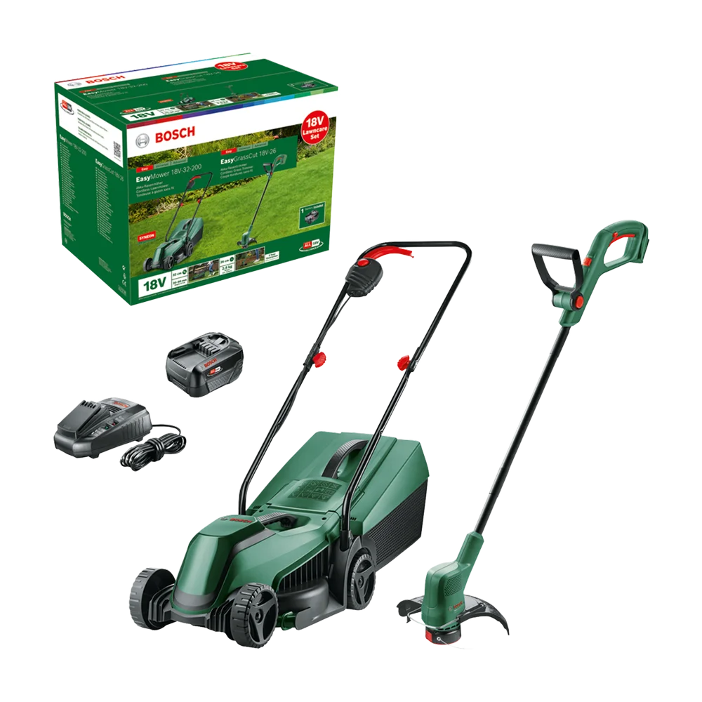 Bosch set za njegu travnjaka – EasyMower 18V-32-200 + EasyGrassCut 18V-26 predstavlja praktično i funkcionalno rješenje za održavanje vrtova i travnjaka. Ovaj set kombinuje akumulatorsku kosilicu i akumulatorski trimer za travu, omogućavajući košnju, podrezivanje i uređivanje ivica travnjaka uz potpunu slobodu rada bez kabla.