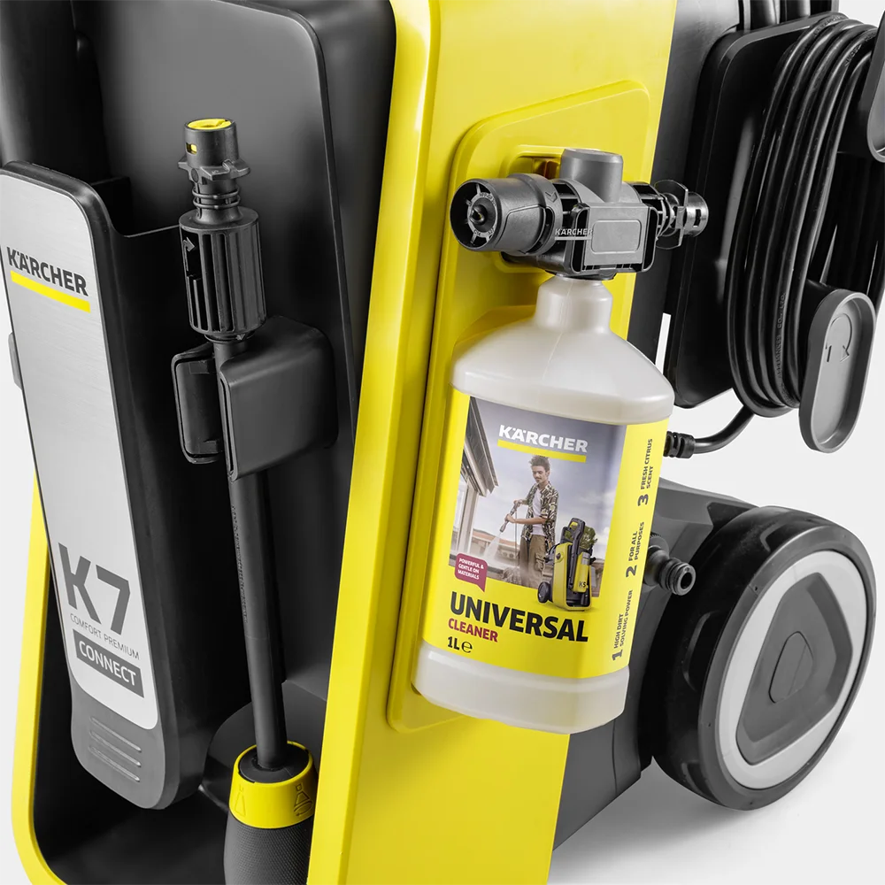 Kärcher K 7 Comfort Premium Connect je vrhunski visokotlačni perač namijenjen intenzivnim i čestim zadacima čišćenja. Zahvaljujući snažnom motoru hlađenom vodom, uređaj osigurava konstantnu snagu i dug vijek trajanja, čak i pri zahtjevnim primjenama. Integrisani bubanj za crijevo s PremiumFlex crijevom dužine 10 m omogućava maksimalnu fleksibilnost i uredno skladištenje.