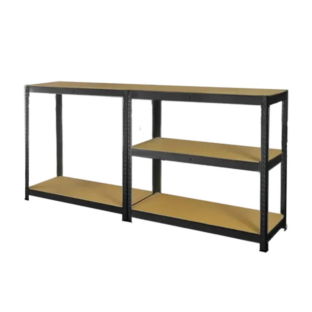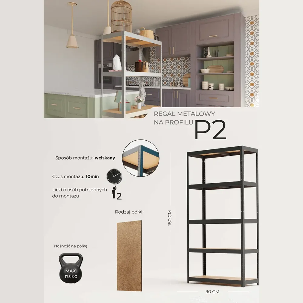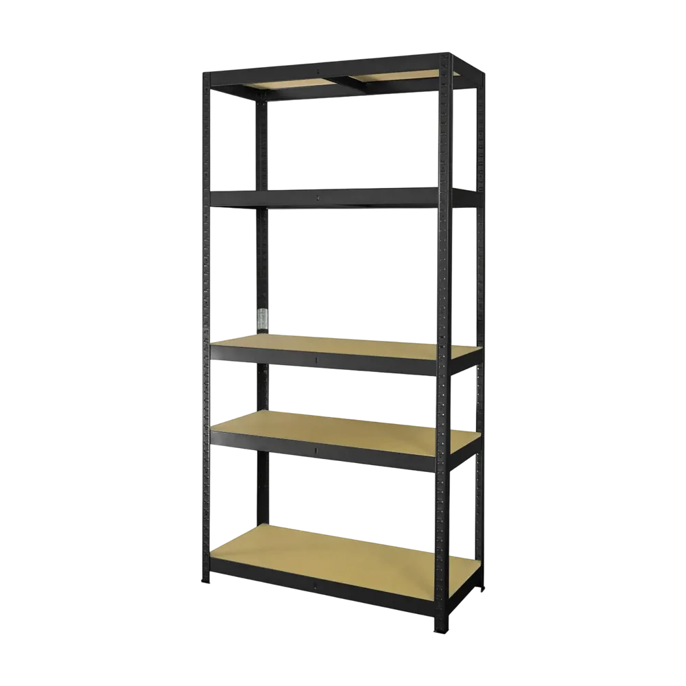 Metalna polica P2P175 180 × 90 × 40 cm – crna mat, s HDF policama je praktično, izdržljivo i moderno rješenje za skladištenje u garaži, radionici, skladištu, ostavi ili poslovnom prostoru. Polica je izrađena od čelične konstrukcije s P2P profilom i zaštićena ekološkom praškastom bojom u crnoj boji (RAL 9005), što osigurava dug vijek trajanja i otpornost na koroziju.