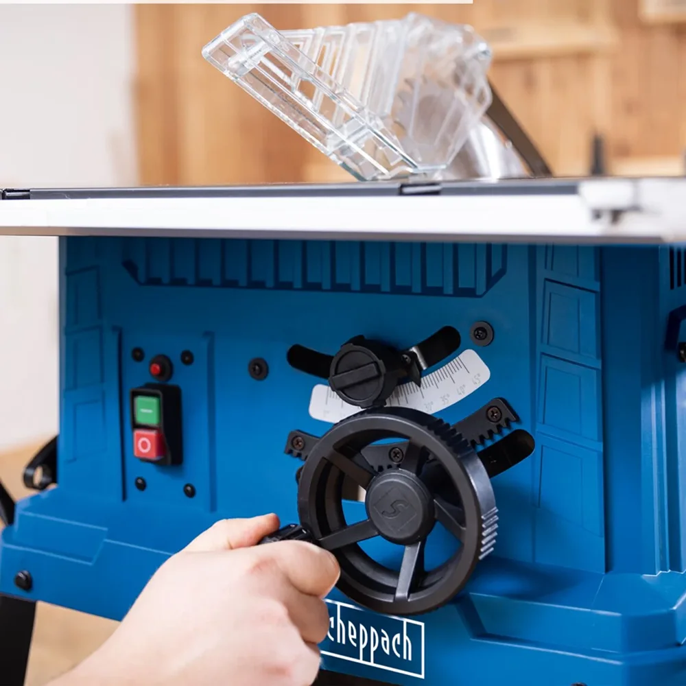 Stabilnost i ergonomija su ključne prednosti modela Scheppach HS254. Pila dolazi na robusnom postolju od čeličnog lima koje obezbjeđuje udoban radni položaj i siguran, nekližući oslonac tokom rada. Visina radne površine od 880 mm prilagođena je dugotrajnoj upotrebi uz minimalan zamor korisnika. Ručni točak omogućava neprekidno i precizno podešavanje visine lista pile, dok se nagib sječiva može kontinuirano podešavati u rasponu od 0° do 45°.