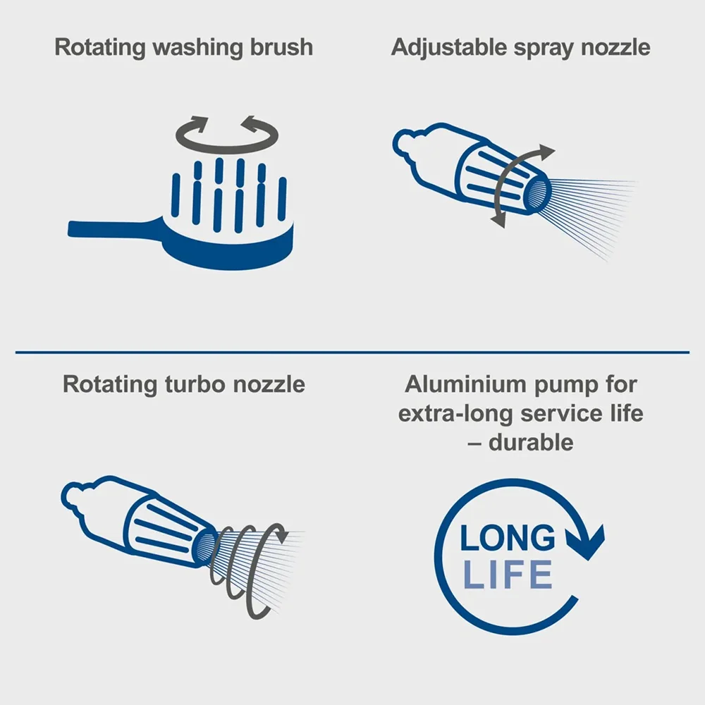 Uz maksimalni protok vode od 480 l/h omogućava brzo i efikasno čišćenje većih površina. Aluminijska pumpa otporna na koroziju osigurava dug radni vijek, dok automatski start/stop sistem štedi energiju jer motor radi samo kada je aktiviran pištolj za pranje.